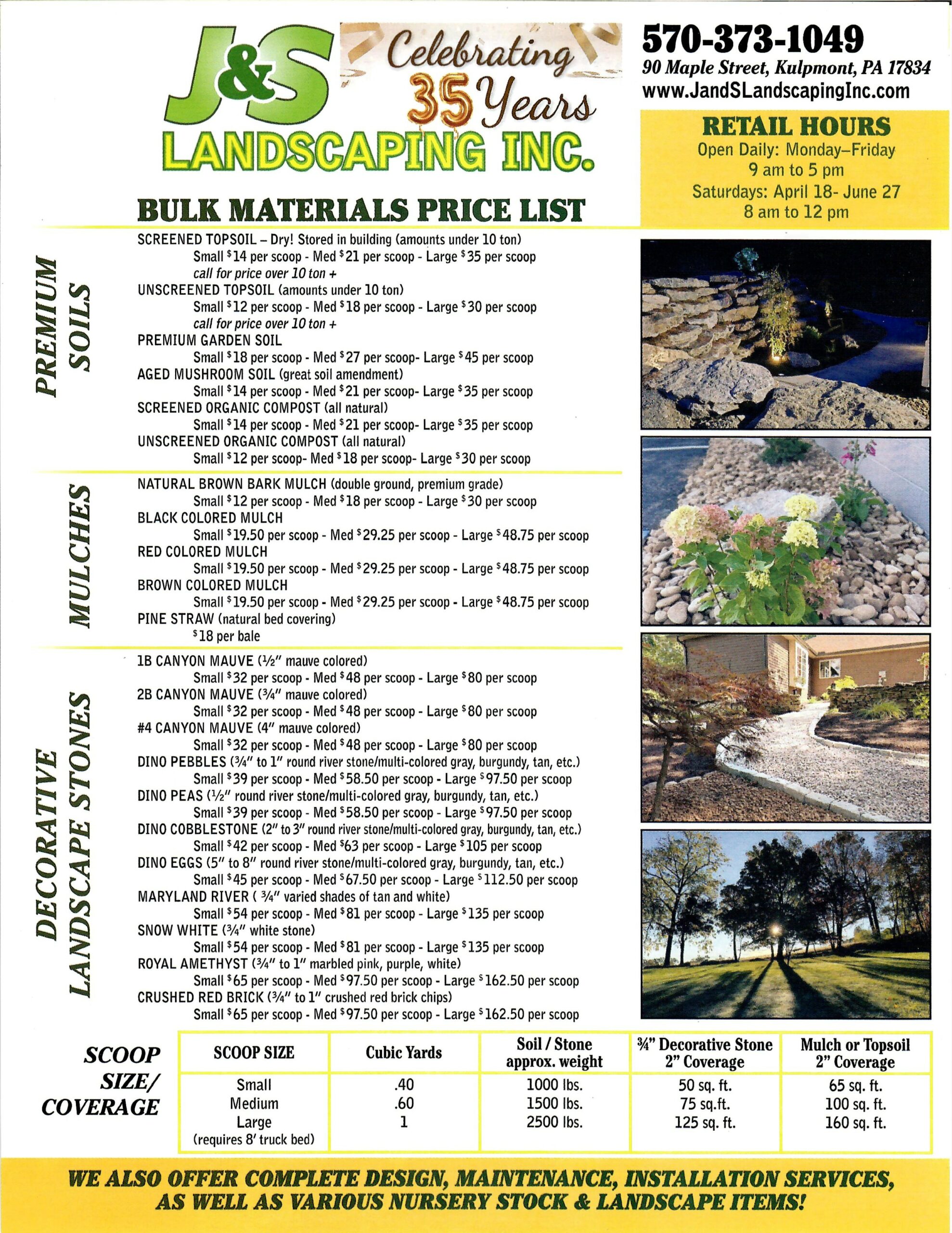 J&S Landscaping, inc. offers an unparalleled assortment of bulk landscaping products and nursery items. We have a collection of materials to suit any need, and our huge list of available items and their competitive pricing speaks for itself.